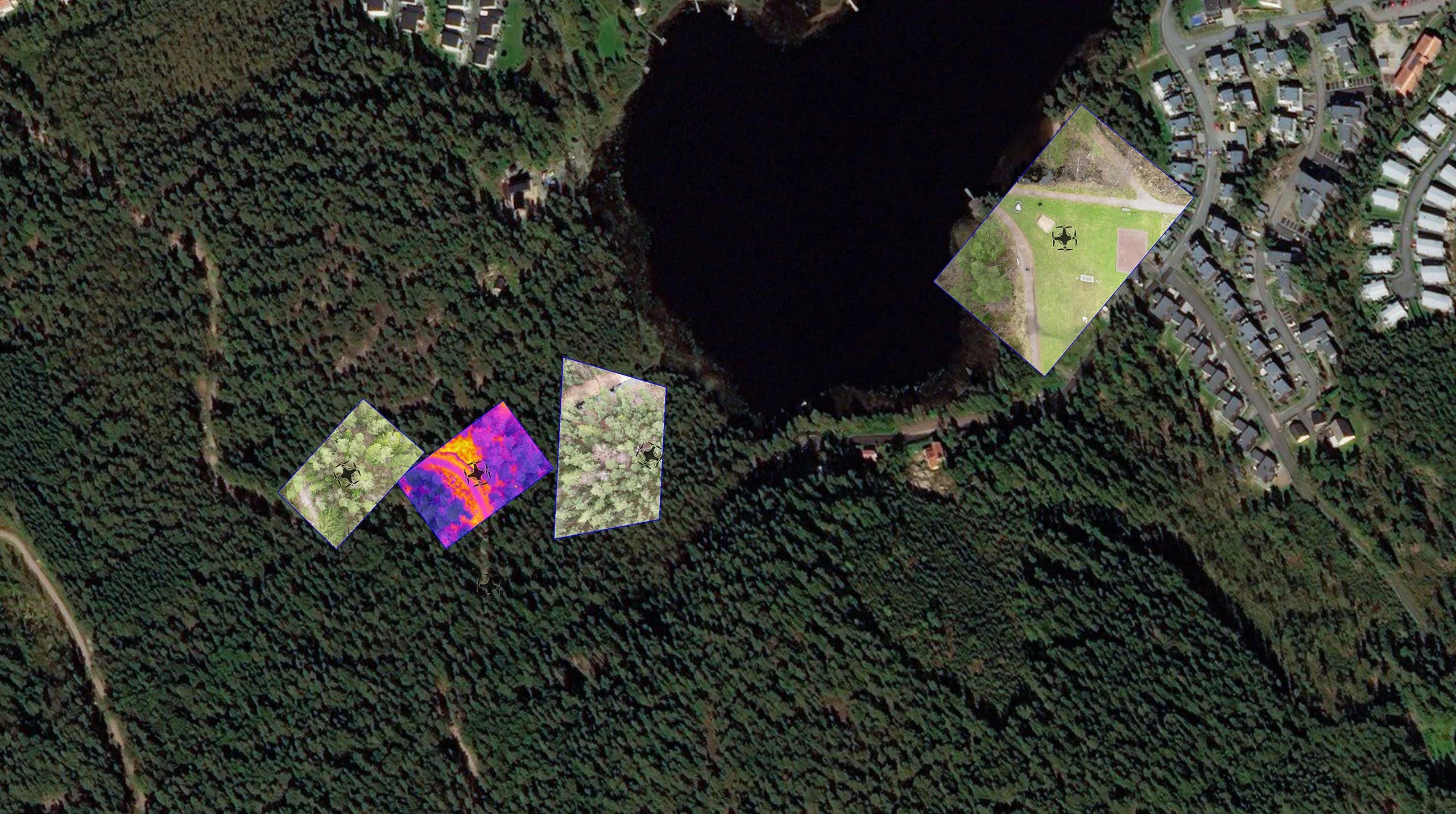 Video feeds from several drones overlayed in real time on a high-resolution satellite image.