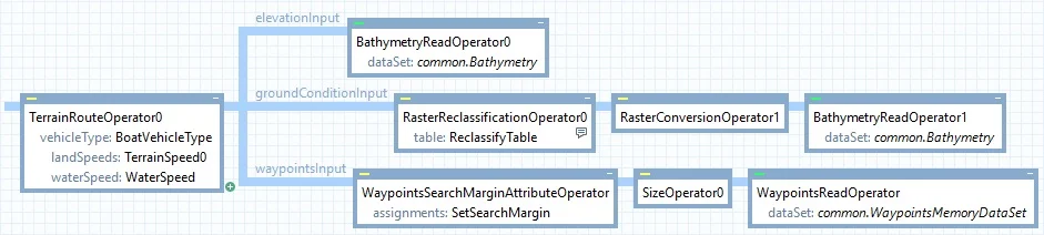 The second way is to build the operator chain in code. This allows for building operator chains dynamically, where conditions at runtime affect how the operator chain is composed. While this solution can provide more flexibility, it also requires more of the developer to foresee and handle different situations. Therefore, building your operator chain in a map configuration file using Carmenta Studio is the suggested approach if your use case allows for it.