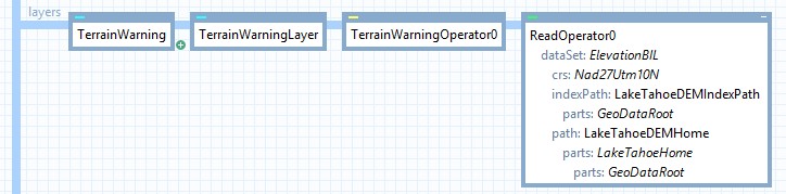 When setting up terrain warning in 2D, a TerrainWarningOperator is needed. The TerrainWarningOperator is used to tag the ground elevation data to enable the TerrainWarningOverlay to use it in the analysis. The TerrainWarningOperator is added as a layer on the View, in this case using an OrdinaryLayer and a TileLayer. The Input property on the TerrainWarningOperator is set to an operator reading ground elevation data.