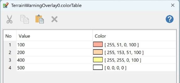 The ColorTable property determines the coloring based on the vertical distance between the ground and the aircraft. The color table below shows a configuration where a distance of less than 100 m is visualized with a red color, a distance between 100 m and 200 m with an orange color, and so on.