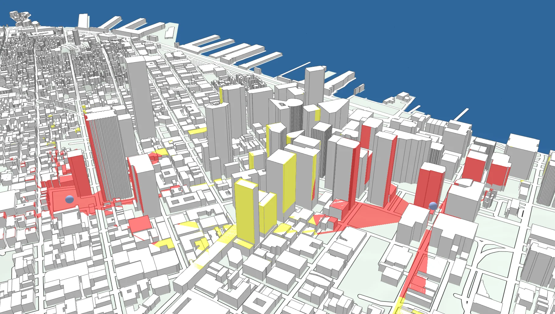 In 3D, line-of-sight analysis can be performed directly on the ground meshes loaded into the view. This provides a very accurate result, especially when used with detailed 3D city models.