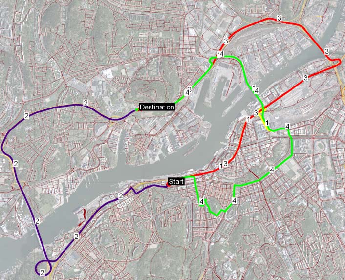 A picture from the thesis report showing alternative routes generated by 2-way search.