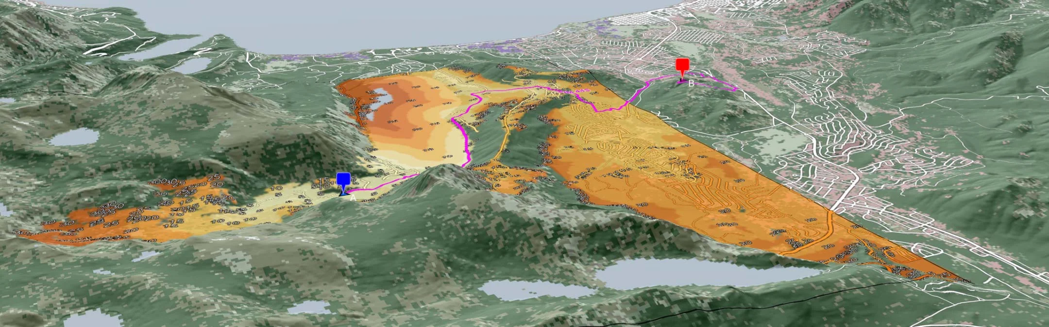 This degree project compares and evaluates several algorithms and methods for computing path isochrones, the complete set of shortest paths to everywhere from a given starting position for large terrain rasters on the GPU. Terrain rasters in this context entails uniform grid data where each grid cell encodes either a traversal cost or the inverse thereof, traversal speed for a specific vehicle. The goal is to find or improve the methods existing for general graphs, optimizing for this specific type of graph. Two implementations are presented, both variations of the commonly used delta-stepping method, one for graphs too large to fit in memory with local pathfinding until convergence, and one for smaller graphs, equivalent to the former, but with the whole graph rather than a subset.
