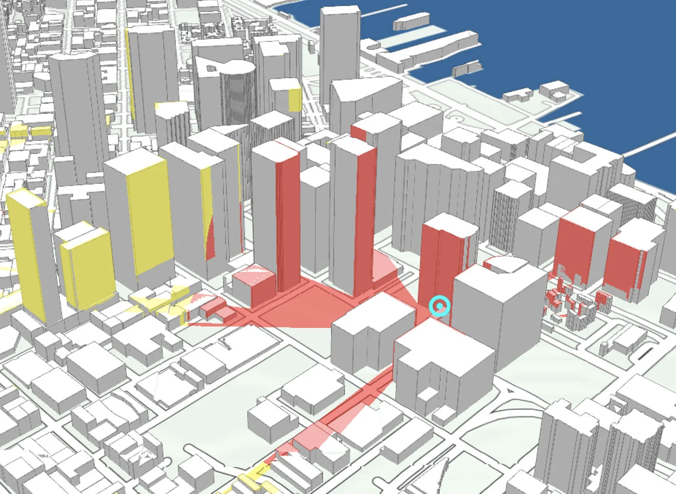 The line-of-sight calculation uses elevation data to compute the regions that have a free line of sight to the position of an observer. The computation is extremely rapid and is designed to be computed on the fly for moving objects and can easily be extended with your own algorithms for calculating radio coverage. There is also possible to calculate viewshed volumes that can be merged into a combined volume that represents airspace covered by observers. For more informations see the feature Visibility Analysis.